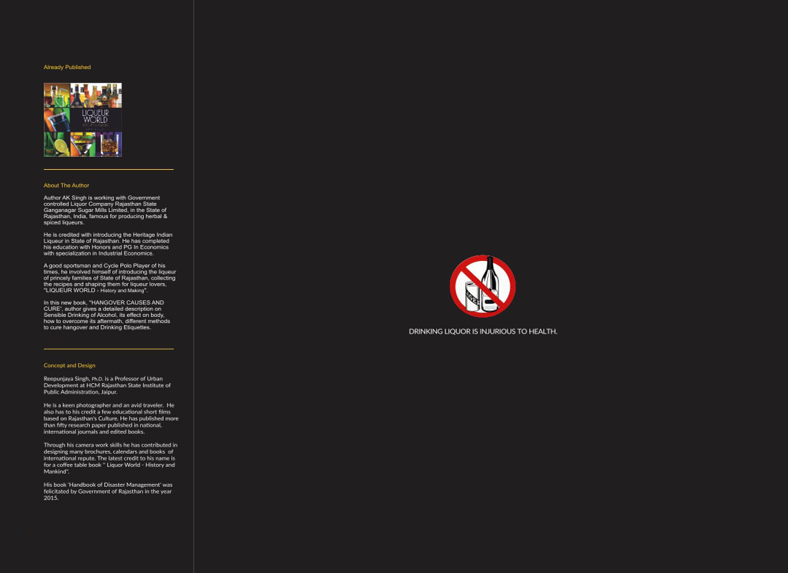 Author A K Singh worked with Government controlled Liqueur (Liquor) Company Rajasthan State Ganganagar Sugar Mills Limited. In state of Rajasthan which is famous for producing herbal and spiced liqueur (liquor). He is credited with Introduction of The Heritage Liqueu (Liquor) in the State. He has completed his education with honours and PG in Economics and specialization in Industrial Economics.